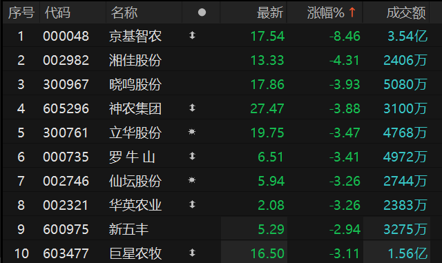 养殖业板块走弱 京基智农跌超8%
