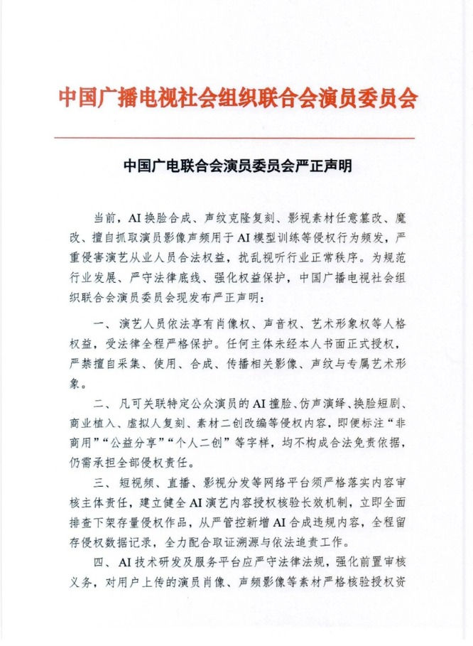 针对愈演愈烈的侵权行为,中广联演员委员会声明明确四大核心立场:一是权益不容侵犯,演员肖像权、声音权、艺术形象权受法律严格保护,未经书面授权,严禁任何主体采集、使用、合成、传播相关影像声纹与艺术形象;二是破除免责借口,标注“非商用”“公益”“二创”的AI换脸、仿声演绎、虚拟人复刻等内容,只要关联特定演员,均不构成免责,必须承担全部侵权责任;三是压实平台责任,短视频、直播、影视平台须建立AI内容授权核验机制,全面下架存量侵权内容,管控新增违规内容,留存数据配合追责;四是约束技术研发,AI技术平台需强化前置审核,严禁为侵权行为提供工具与便利,严守法律底线。