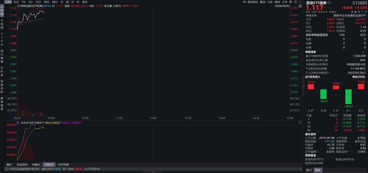 通信ETF国泰(515880)大涨超3%,昨日净流入超1.7亿元,覆盖光模块、铜连接、光纤光缆等算力核心环节,是把握本轮AI算力新周期的核心工具。