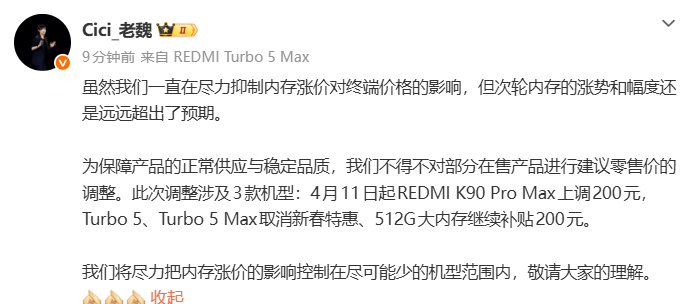 4月3日,小米中国区市场部总经理魏思琪发文表示,为保障产品的正常供应与稳定品质,将对在售产品进行建议零售价的调整。此次调整涉及3款机型:4月11日起REDMI K90 Pro Max上调200元,Turbo 5、Turbo 5 Max取消新春特惠、512G大内存继续补贴200元。