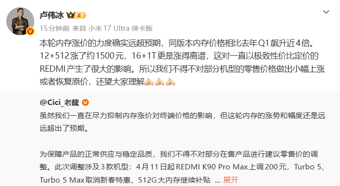 小米集团合伙人、总裁卢伟冰也表示,“本轮内存涨价的力度确实远超预期,同版本内存价格相比去年Q1飙升近4倍。12+512涨了约1500元,16+1T更是涨得离谱,这对一直以极致性价比定价的REDMI产生了很大的影响。所以我们不得不对部分机型的零售价格做出小幅上涨或者恢复原价,还望大家理解”。