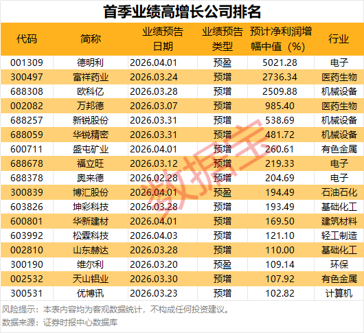 业绩预喜公司中,以预计净利润增幅中值统计,共有17家公司净利润增幅超100%;德明利预计净利润增幅最高。公司预计一季度净利润增幅中值为5021.28%;富祥药业、欧科亿预计净利润同比增幅中值分别为2736.34%、2509.88%,增幅位列第二、第三。
