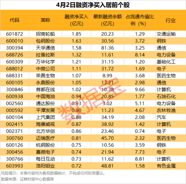 具体到个股,4月2日共有1642只股获融资净买入,净买入金额在千万元以上的有304只,其中9只融资净买入额超1亿元。招商轮船融资净买入额居首,当日净买入1.85亿元;其次是包钢股份、天孚通信,融资净买入金额分别为1.63亿元、1.58亿元;融资净买入金额居前的还有拉普拉斯、万华化学、中微公司等。