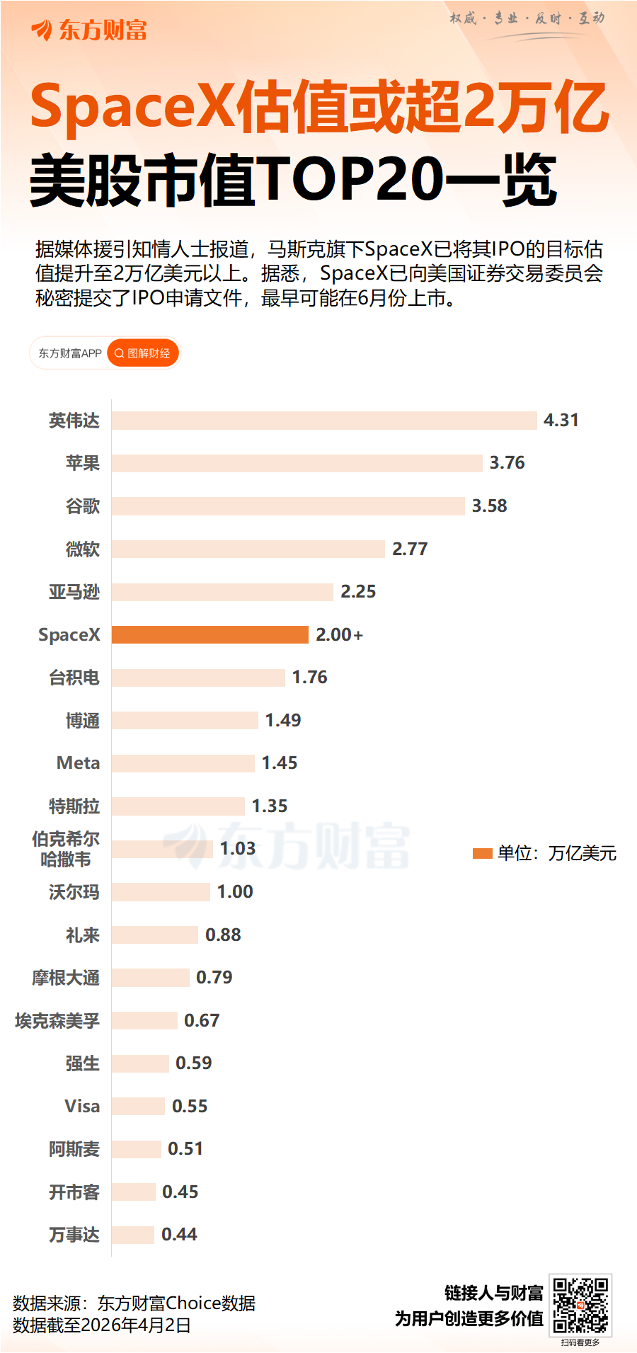 SpaceX估值或超2万亿 一图速览美股市值TOP20