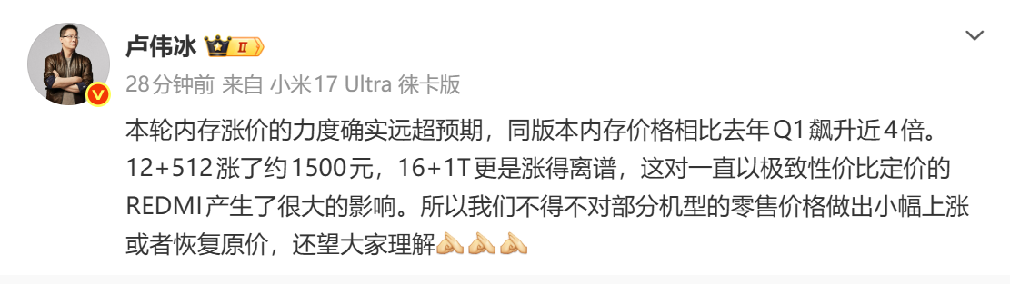 受内存涨价影响,小米调整REDMI部分产品售价
