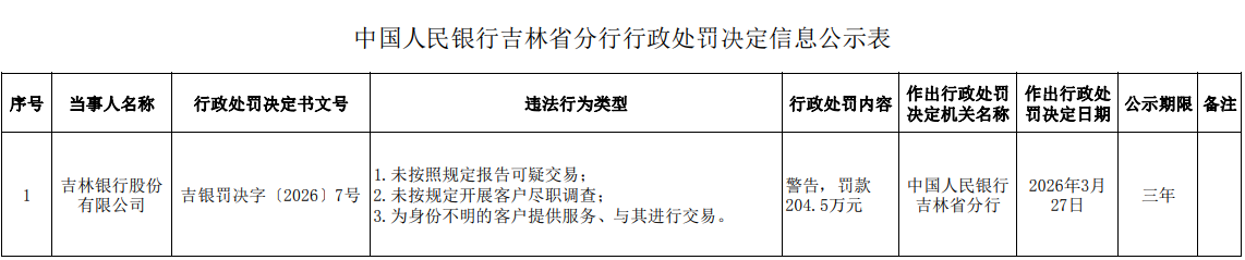 【大河财立方消息】4月3日,吉林银行因未按照规定报告可疑交易,未按规定开展客户尽职调查,为身份不明的客户提供服务、与其进行交易等违法行为,被中国人民银行吉林省分行警告,罚款204.5万元。