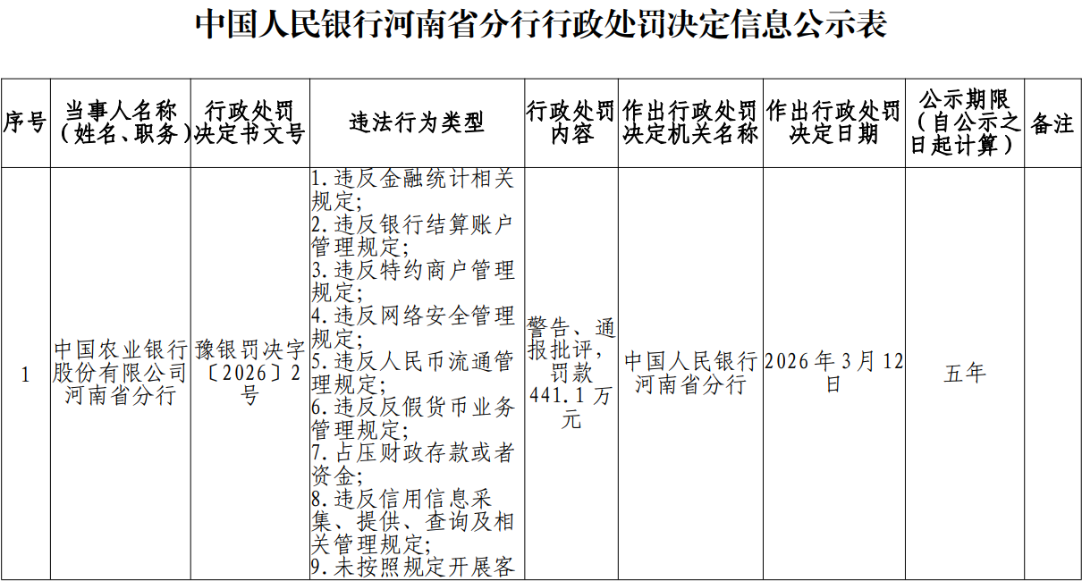 农业银行河南省分行被通报批评、罚款441万元