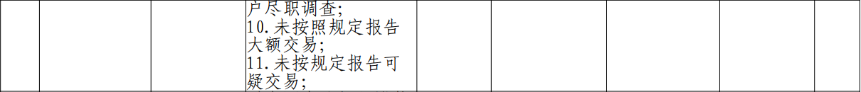 违反金融统计相关规定;违反银行结算账户管理规定;违反特约商户管理规定;违反网络安全管理规定;违反人民币流通管理规定;违反反假货币业务管理规定;占压财政存款或者资金;违反信用信息采集、提供、查询及相关管理规定;未按照规定开展客户尽职调查;未按照规定报告大额交易;未按规定报告可疑交易。