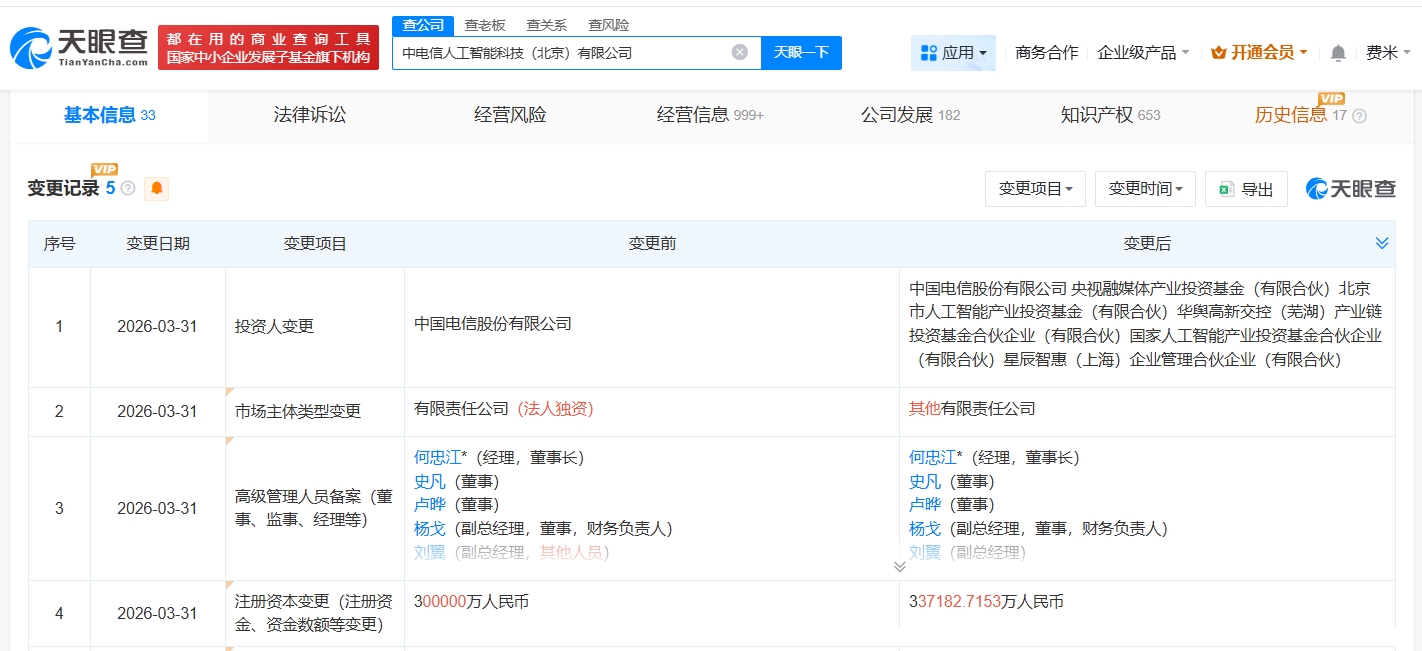 南方财经4月3日电,天眼查App显示,近日,中电信人工智能科技(北京)有限公司发生工商变更,新增北京市人工智能产业投资基金(有限合伙)、国家人工智能产业投资基金合伙企业(有限合伙)等为股东,同时,注册资本由30亿人民币增至约33.7亿人民币,增幅约12%。该公司成立于2023年11月,法定代表人为何忠江,经营范围含人工智能行业应用系统集成服务、人工智能基础资源与技术平台、人工智能理论与算法软件开发等,现由中国电信(601728)及上述新增股东共同持股。