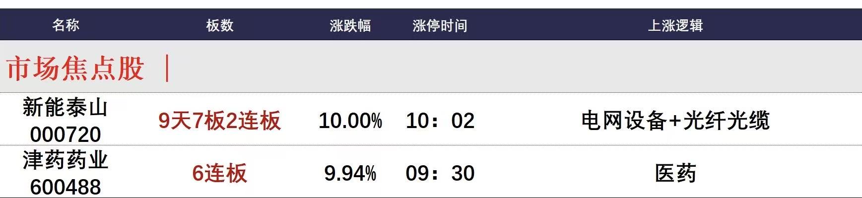 今日午盘全市场共21股涨停,连板股总数4只,14股封板未遂,封板率为60%(不含ST股、退市股)。焦点股方面,光纤概念股新能泰山9天7板,医药板块津药药业6连板。