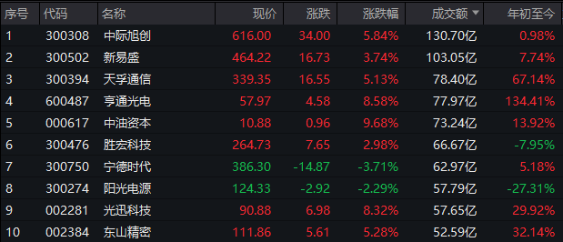 个股方面,中际旭创半日成交额超130亿元居首,新易盛、天孚通信、亨通光电成交额靠前。