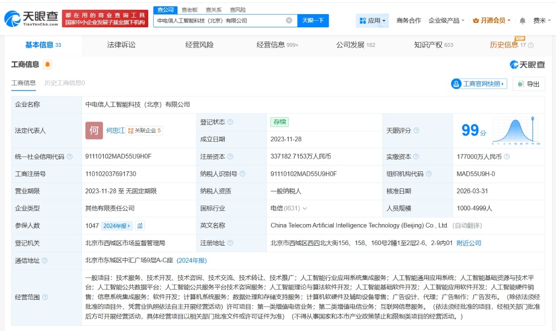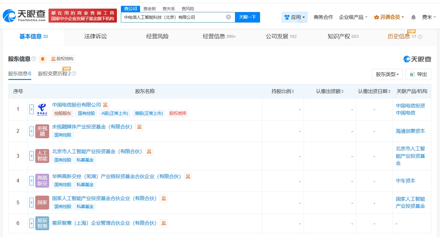 每经AI快讯,天眼查App显示,近日,中电信人工智能科技(北京)有限公司发生工商变更,新增北京市人工智能产业投资基金(有限合伙)、国家人工智能产业投资基金合伙企业(有限合伙)等为股东,同时,注册资本由30亿元人民币增至约33.7亿元人民币,增幅约12%。该公司成立于2023年11月,法定代表人为何忠江,经营范围含人工智能行业应用系统集成服务、人工智能基础资源与技术平台、人工智能理论与算法软件开发等,现由中国电信(601728)及上述新增股东共同持股。