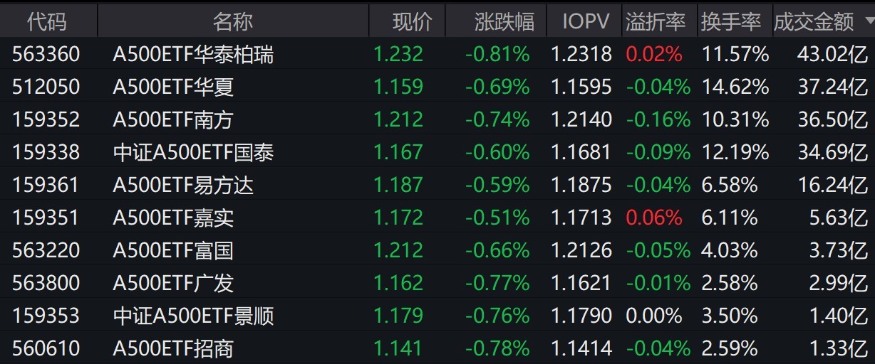 截至上午收盘,场内跟踪中证A500指数的ETF跌近1%。其中,有10只中证A500相关ETF成交额超1亿元,2只超37亿元。A500ETF华泰柏瑞、A500ETF华夏早盘成交额分别为43.02亿元、37.24亿元。
