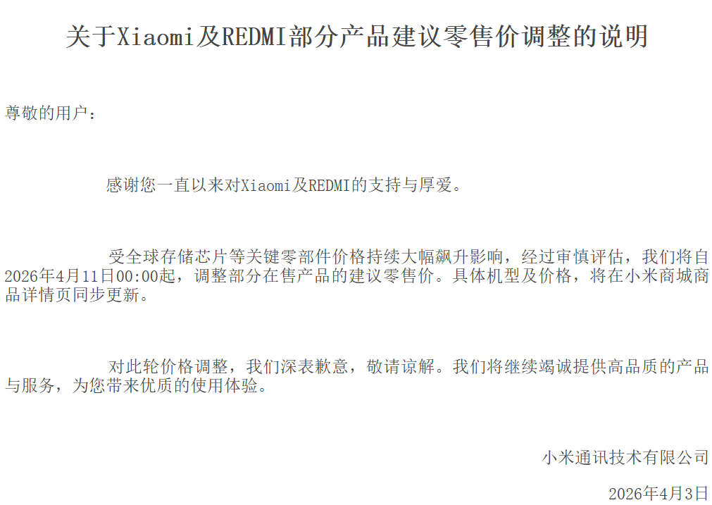 4月3日,小米宣布,受全球存储芯片等关键零部件价格持续大幅飙升影响,自2026年4月11日起,将调整部分在售产品的建议零售价。