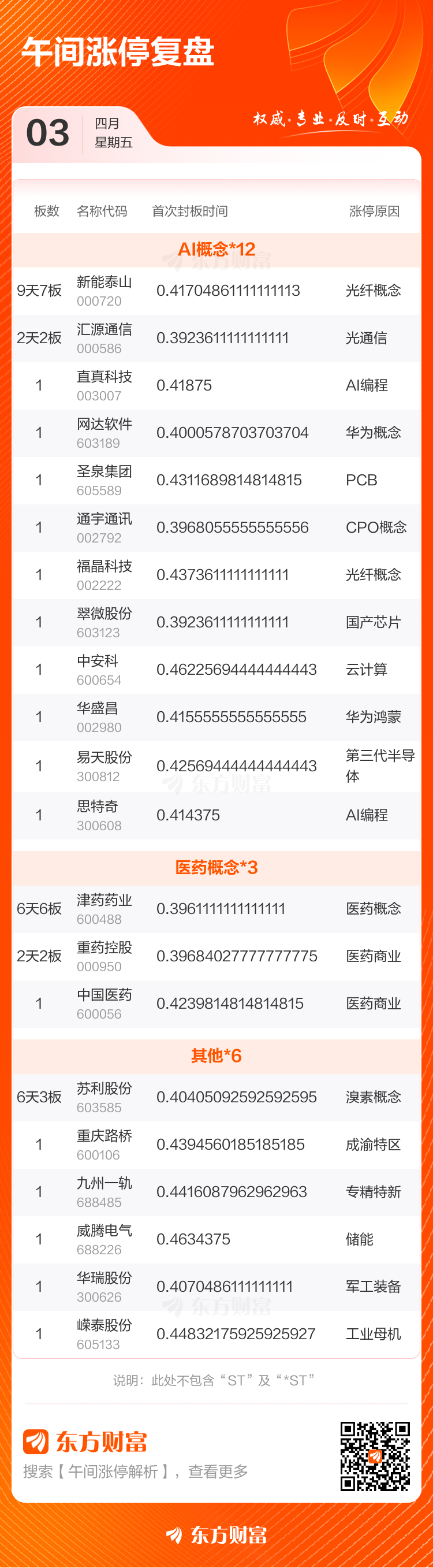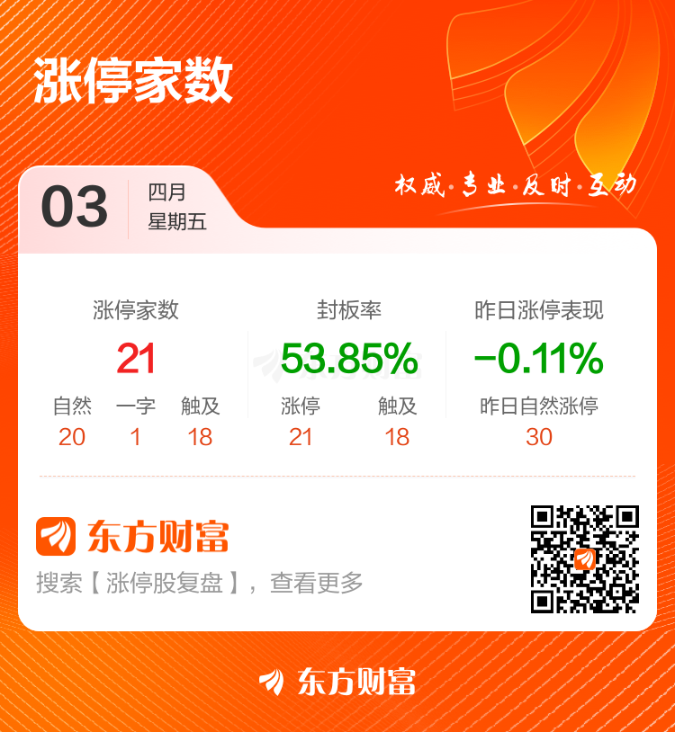 4月3日午间涨停复盘:21股涨停 新能泰山9天7板