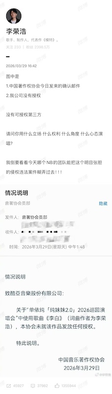 一切变化始于3月29日。向来以松弛形象示人的李荣浩,当天在微博发布一篇措辞严厉的长文,喊话新生代歌手单依纯:“请问你用什么立场、什么权利、什么角度、什么心态演唱?”他晒出中国音乐著作权协会的确认邮件,证明自己从未授权单依纯在深圳演唱会上翻唱他的代表作《李白》。这场版权纠纷迅速登上热搜。