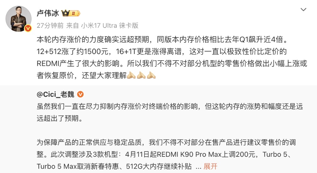 “为保障产品的正常供应与稳定品质,我们不得不对部分在售产品进行建议零售价的调整。此次调整涉及3款机型:4月11日起REDMI K90 Pro Max上调200元,Turbo 5、Turbo 5 Max取消新春特惠、512G大内存继续补贴200元。”魏思琪强调,小米将尽力把内存涨价的影响控制在尽可能少的机型范围内。