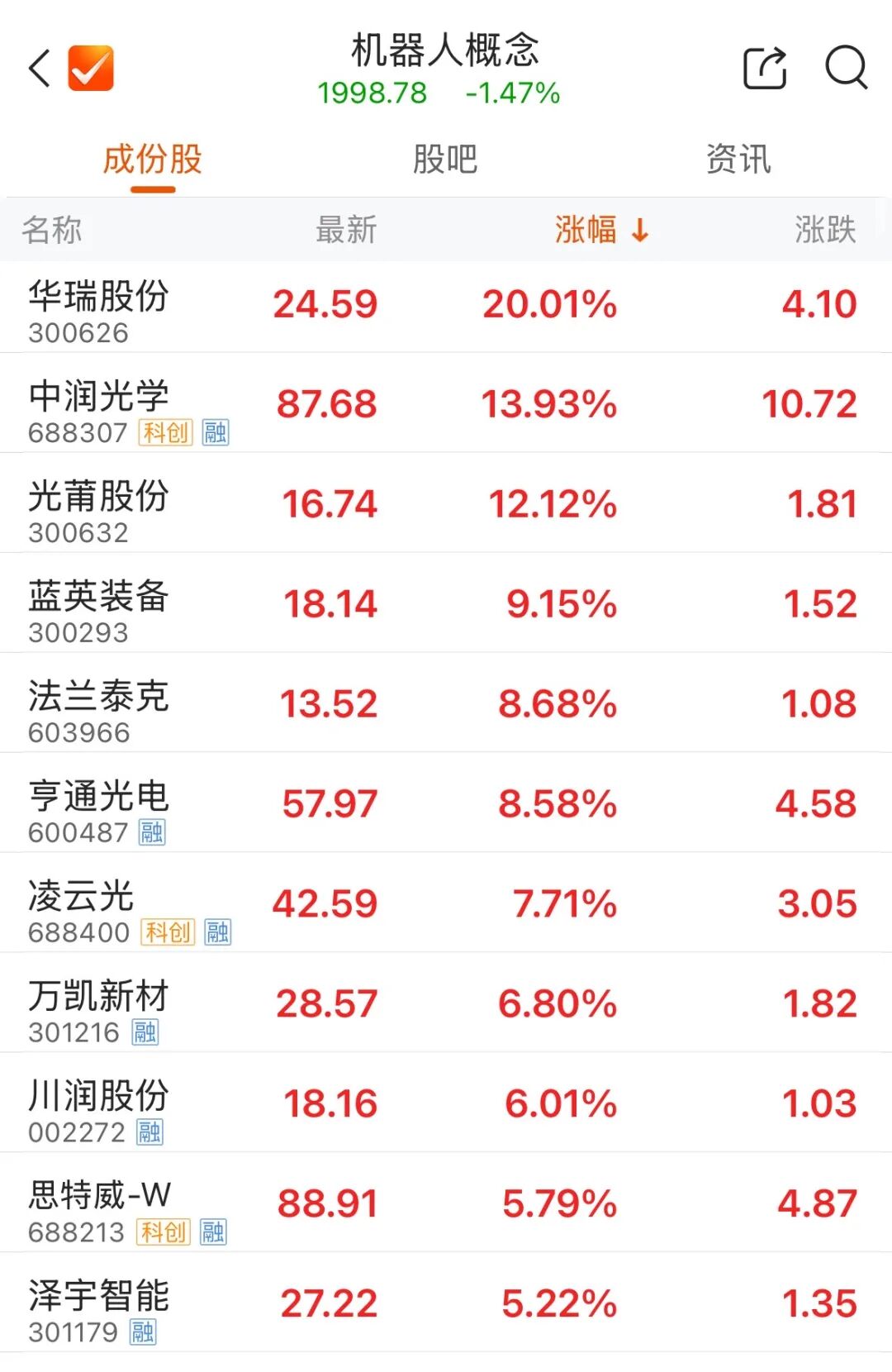 早盘,机器人概念局部走强。截至午间收盘,华瑞股份以20%幅度涨停,嵘泰股份涨停。