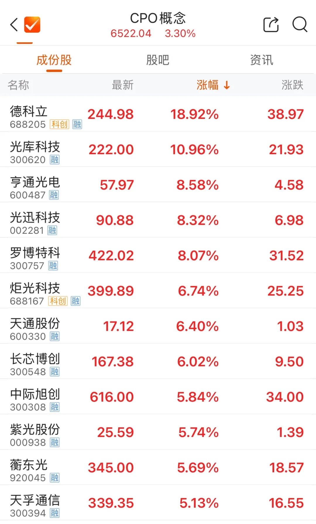 早盘,CPO概念震荡拉升,德科立盘中触及“20cm”涨停,通宇通讯开盘2分钟直线拉升涨停。截至午间收盘,德科立涨近19%,光库科技、长光华芯涨超10%,中际旭创、天孚通信涨超5%。