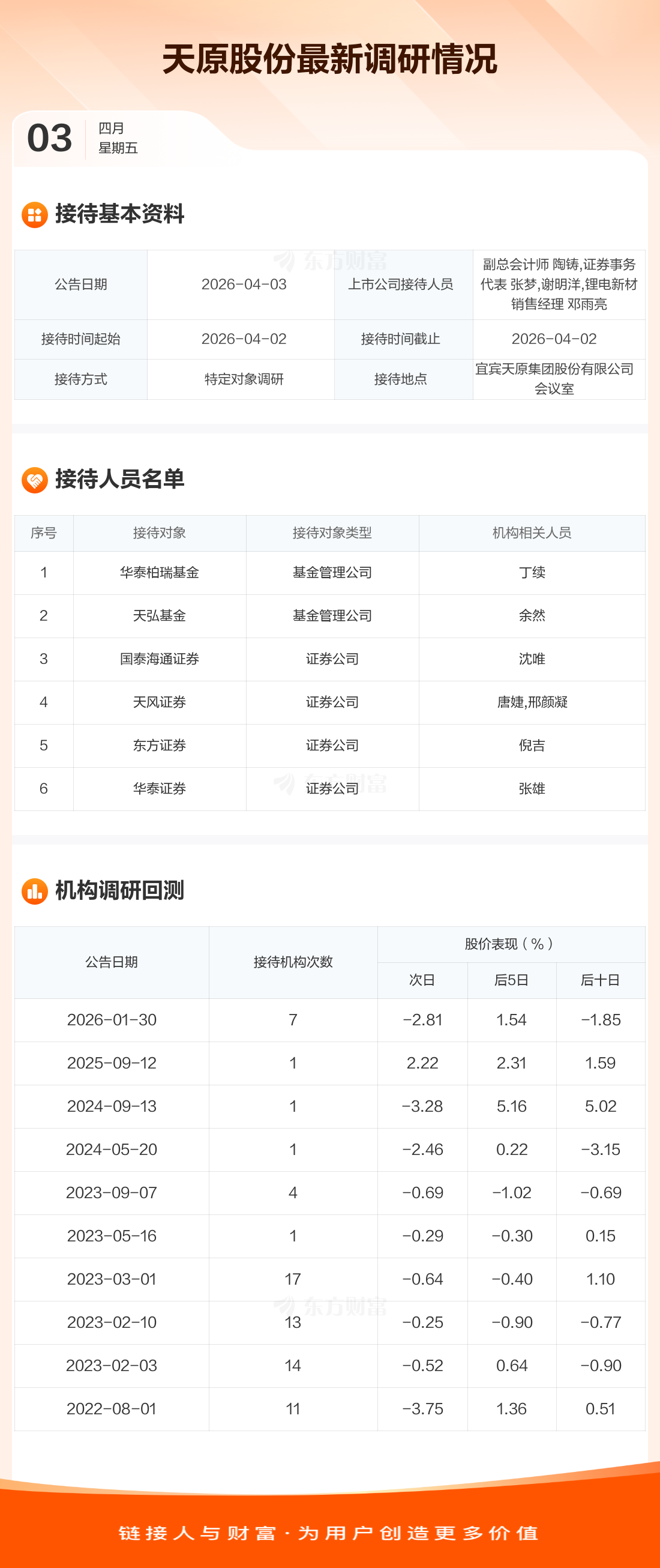 天原股份4月3日公告称,4月2日接待华泰柏瑞基金等6家机构调研。接待人员包括副总会计师 陶铸,证券事务代表 张梦,谢明洋,锂电新材销售经理 邓雨亮。