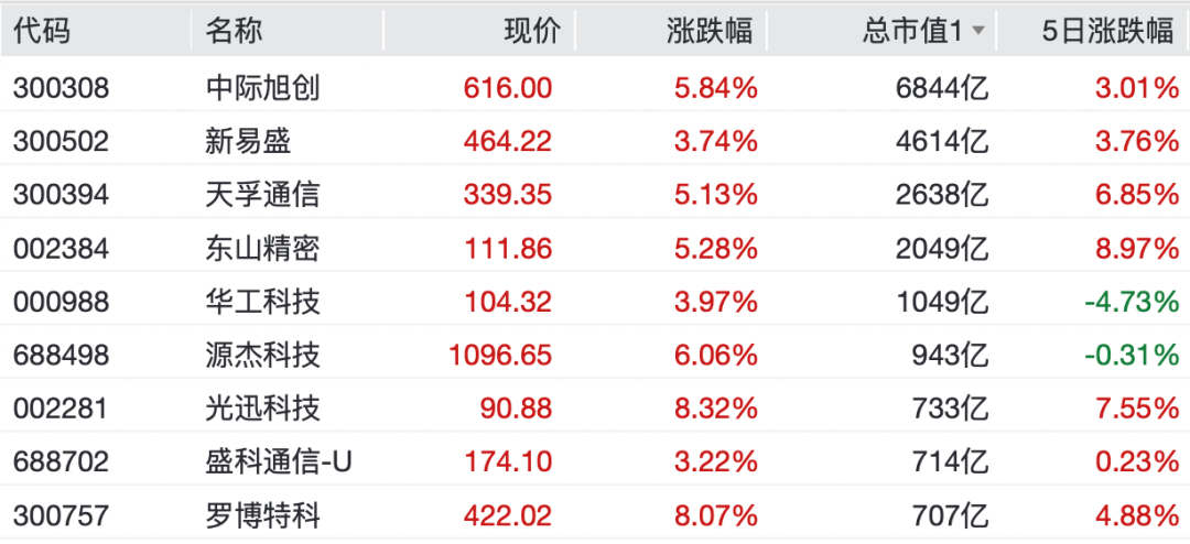 “易中天”大涨,中际旭创涨5.84%,现报616元/股,新易盛涨3.74%,现报464.22元/股,天孚通信涨5.13%,现报339.35元/股。