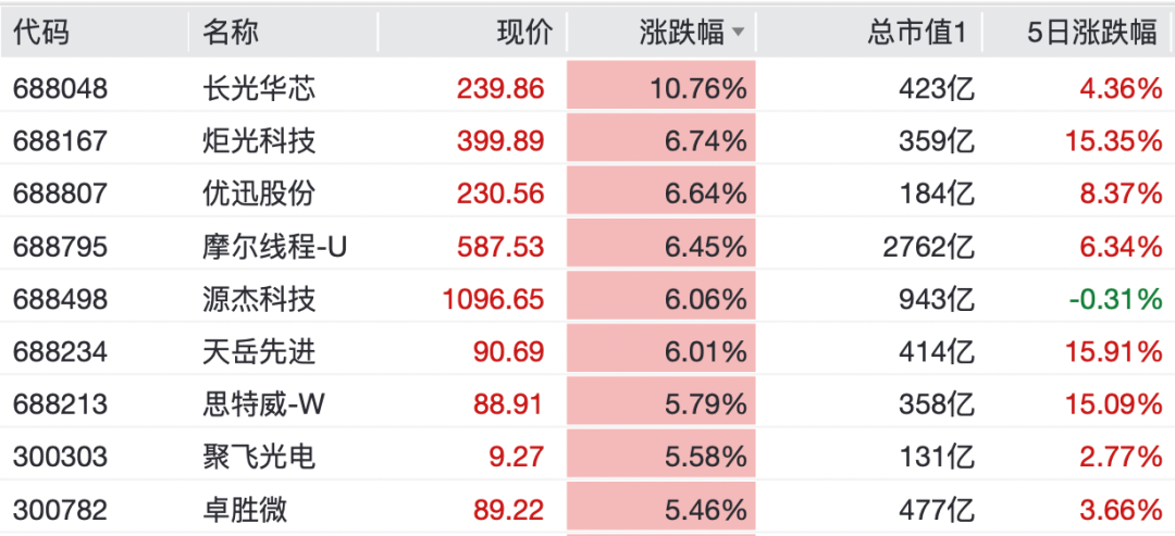 个股方面,寒武纪涨超2%,摩尔线程涨超6%,沐曦股份涨近3%,长光华芯涨超10%,优迅股份、炬光科技、天岳先进等均涨超6%。