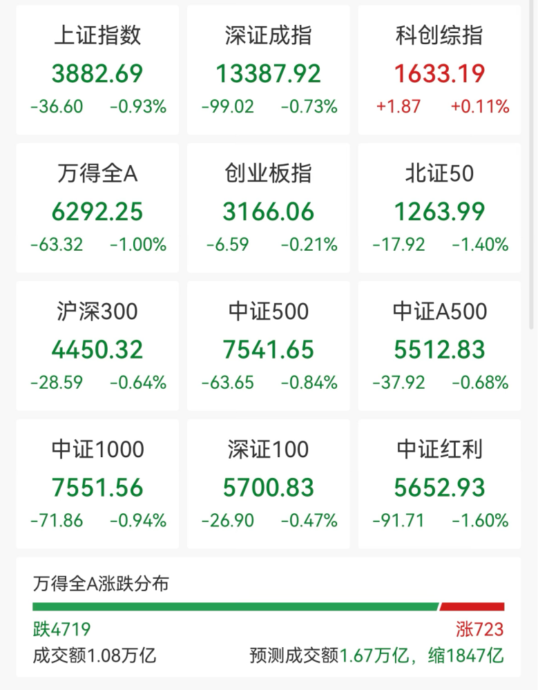 截至午间收盘,沪指跌0.93%,深证成指跌0.73%,创业板指跌0.21%,科创综指涨0.11%。