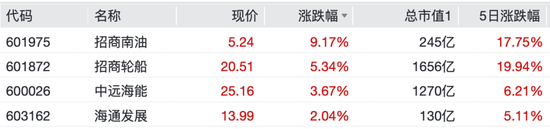 个股方面,招商轮船涨超5%,招商南油涨超9%,中远海能涨3.67%,海通发展等纷纷上涨。