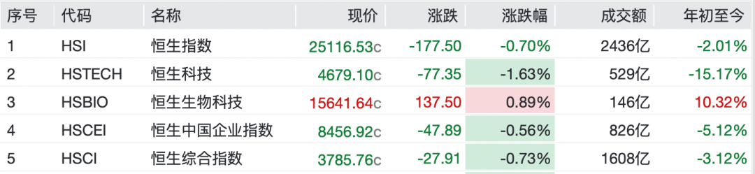 港股市场涨跌不一,恒生生物科技指数上涨。截至发稿,恒生指数跌0.7%,恒生科技指数跌1.63%,恒生生物科技涨0.89%。个股方面,翰森制药、诺诚健华、金斯瑞生物科技、再鼎医药等纷纷上涨;而华虹半导体跌超5%,小米集团、中芯国际、阿里巴巴均跌超3%。