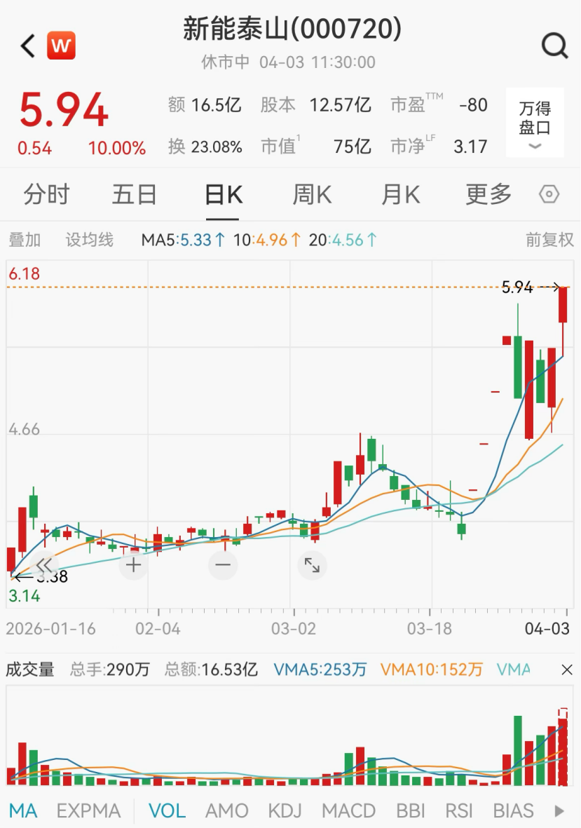 上午新能泰山再次涨停,录得9天7板。