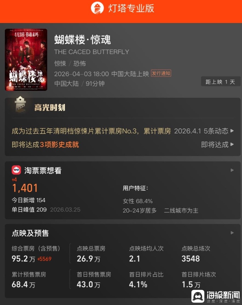 据悉,今年惊悚片的集中入局源于低成本、高回报的赛道特性,2024年《鸳鸯楼·惊魂》曾斩获1.3亿元票房,但此次预售数据显示,观众对于清明档的观影需求已从单纯的感官刺激,转向更具情绪价值的情感共鸣,惊悚片虽能满足特定下沉市场观众需求,却难以成为档期主流。
