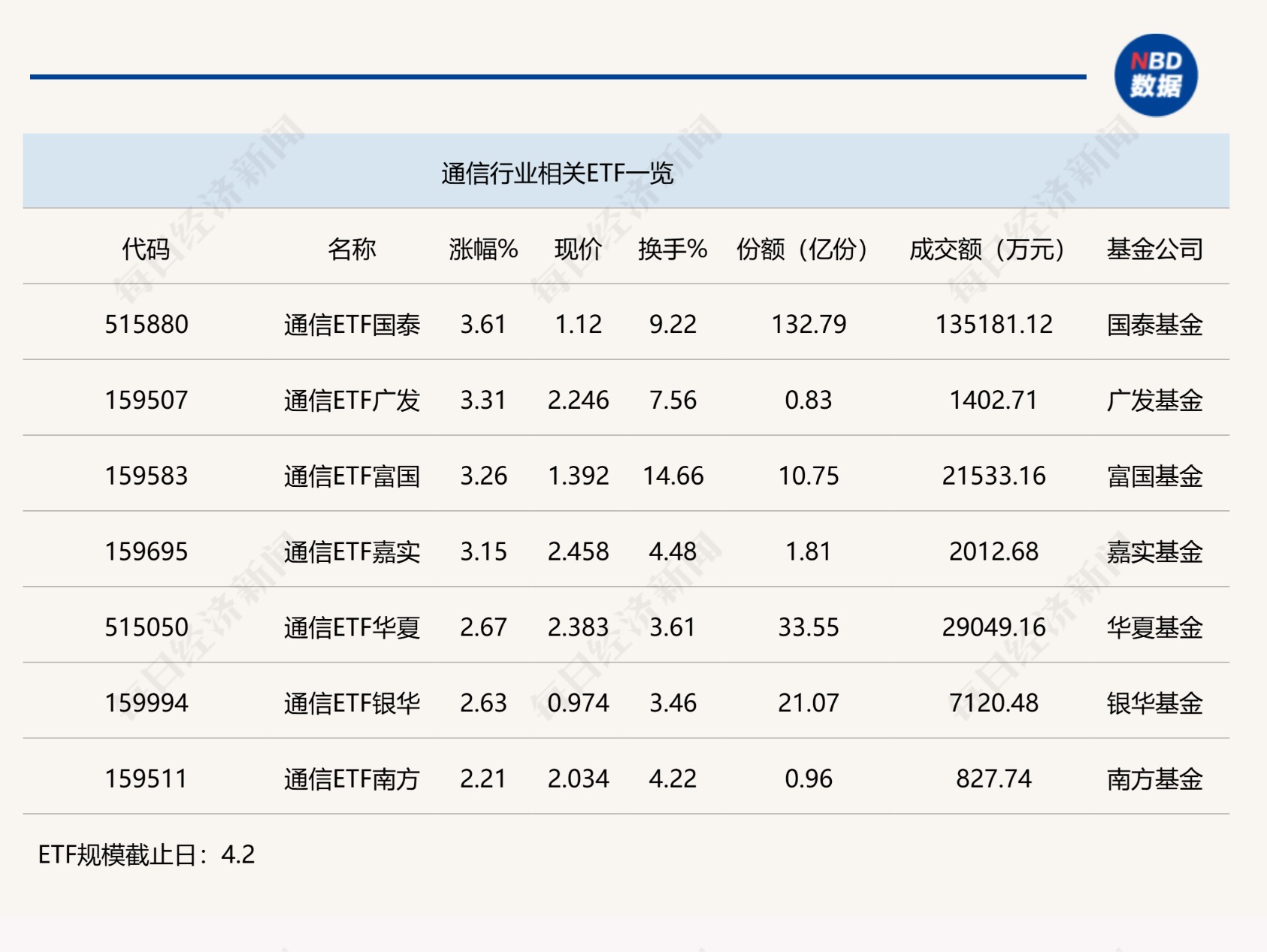 点评:通信ETF广发(159507)今日上午涨幅为3.31%,其份额仅0.83亿份,追踪的是国证通信指数。追踪该指数的ETF还有通信ETF嘉实(159695)。