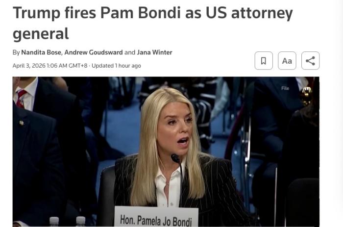 中新网4月3日电据路透社报道,美国总统特朗普2日解除了美国司法部长帕姆·邦迪的职务,原因是对她的工作表现日益不满,尤其集中在对已故性犯罪者爱泼斯坦档案的处理事宜上。