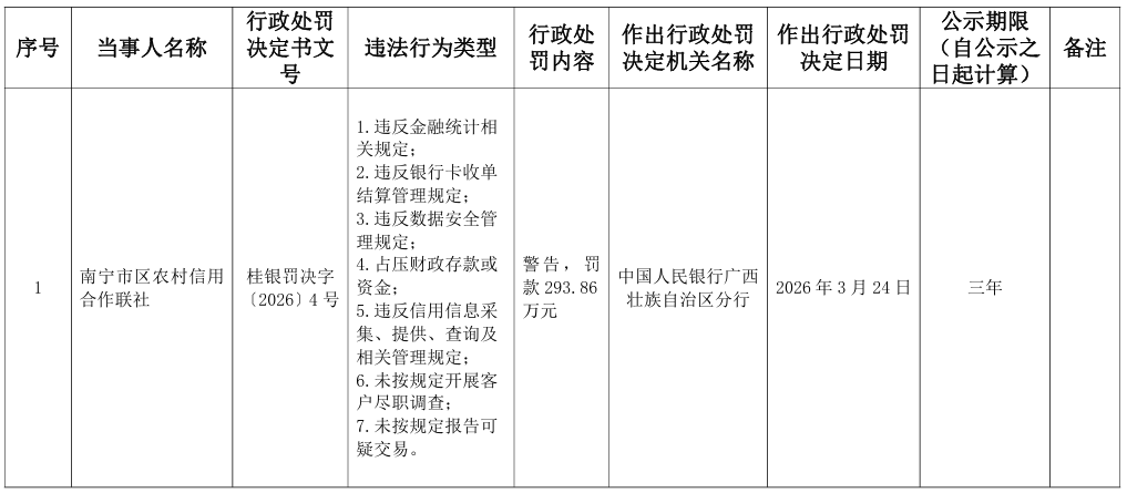 南宁市区农村信用合作联社被罚293万元