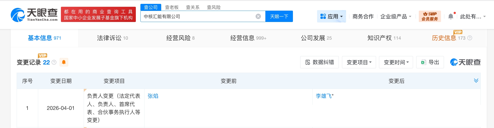 南方财经4月3日电,天眼查工商信息显示,近日,中核汇能有限公司发生工商变更,张焰卸任法定代表人、董事长,由李雄飞接任,同时,多位高管发生变更。中核汇能有限公司成立于2011年11月,注册资本约28.6亿人民币,经营范围含发电业务、输电业务、供(配)电业务,地热资源开采,储能技术服务,风力发电技术服务等。股东信息显示,该公司由中国核电(601985)、中国人寿资产管理有限公司、川投能源(600674)等共同持股。