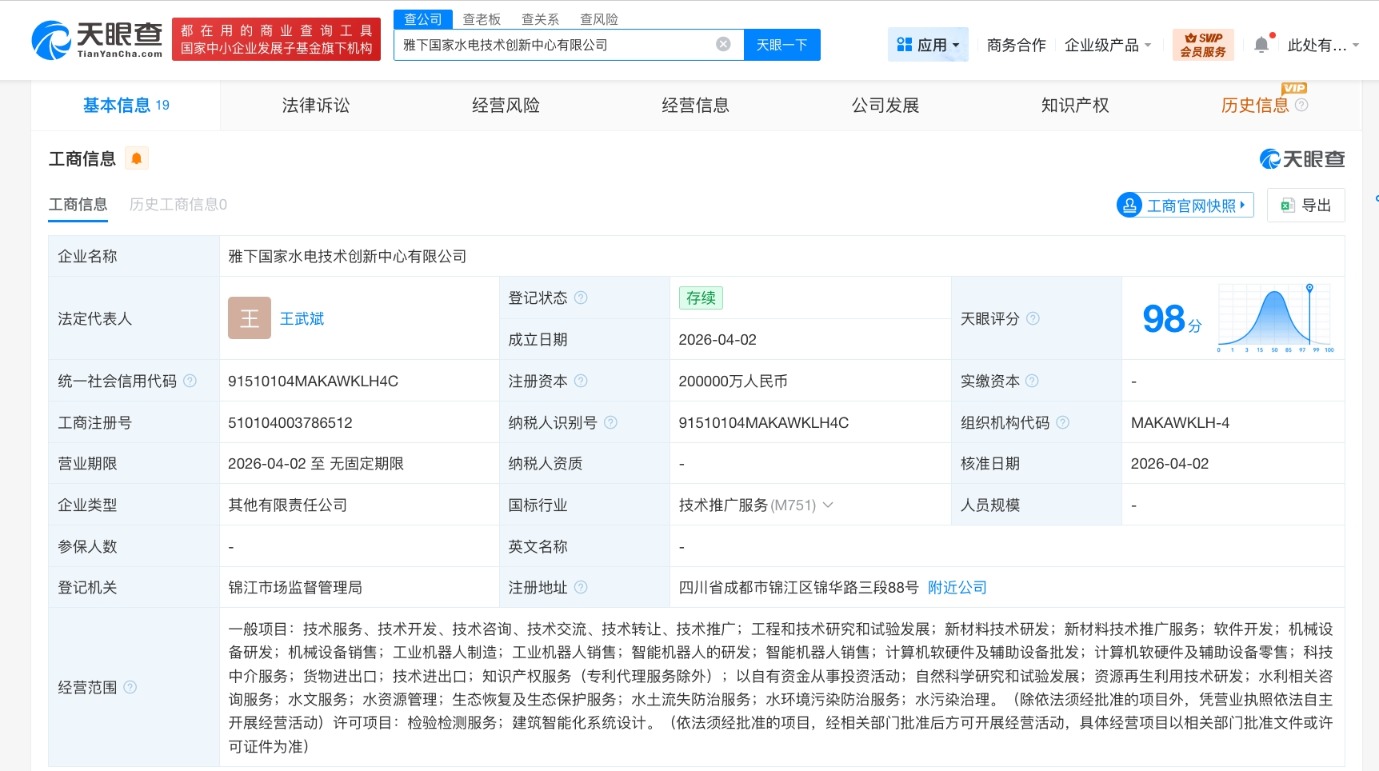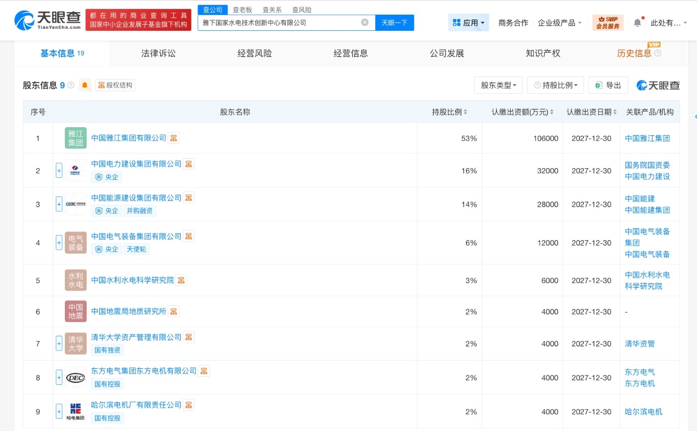 天眼查工商信息显示,近日,雅下国家水电技术创新中心有限公司成立,法定代表人为王武斌,注册资本20亿人民币,经营范围包括工程和技术研究和试验发展、水利相关咨询服务、水资源管理、检验检测服务等。股东信息显示,该公司由中国雅江集团有限公司、中国电力建设集团有限公司、中国能源建设集团有限公司、中国电气装备集团有限公司等共同持股。