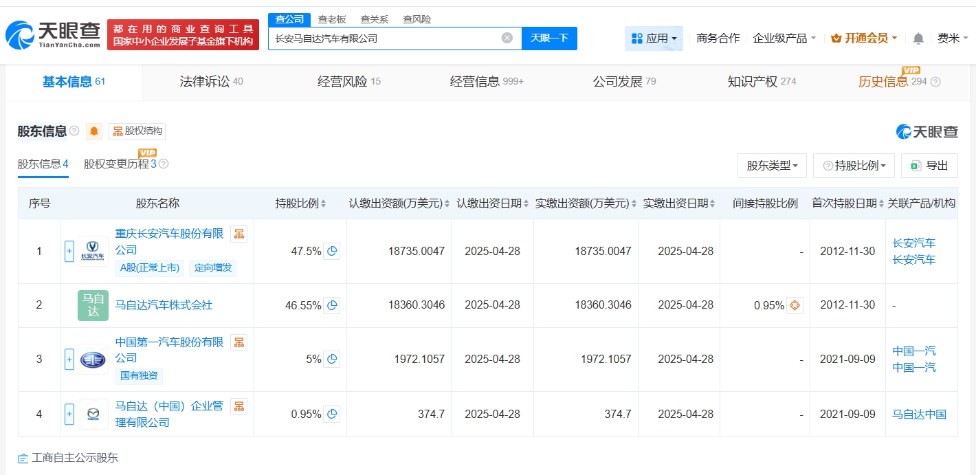 每经AI快讯,天眼查App显示,近日,长安马自达汽车有限公司发生工商变更,张德勇卸任法定代表人、董事长、董事,由倪尔科接任。该公司成立于2012年11月,注册资本约3.94亿美元,经营范围含道路机动车辆生产、汽车销售、新能源汽车整车销售等,由长安汽车(000625)、马自达汽车株式会社、中国第一汽车股份有限公司、马自达(中国)企业管理有限公司共同持股。