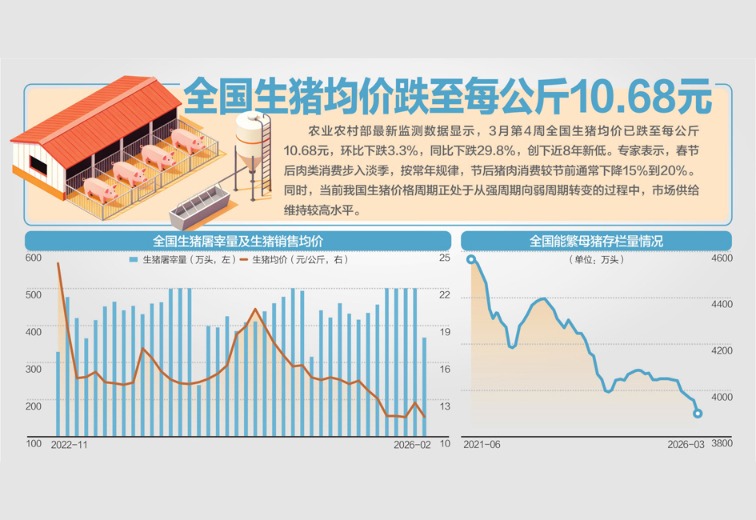 中国农业科学院农业经济与发展研究所研究员、国家生猪产业技术体系产业经济岗位科学家王祖力在接受《每日经济新闻》记者电话采访时表示,3月份第4周全国生猪平均价格10.68元/公斤,为近8年低点,已连续8周下跌。