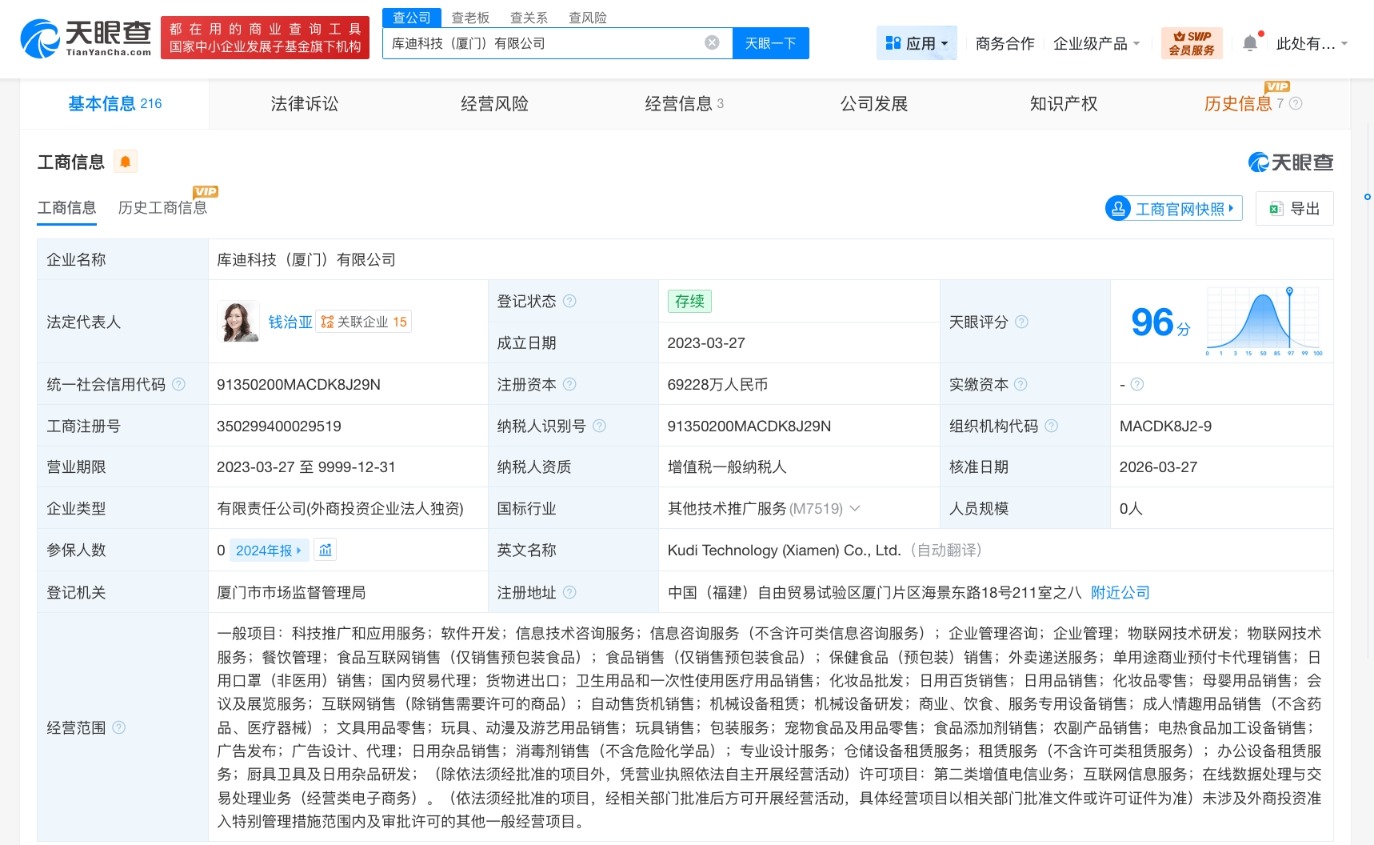南方财经4月3日电,天眼查工商信息显示,近日,库迪科技(厦门)有限公司发生工商变更,注册资本由1亿人民币增至6.9亿人民币,增幅约692%。该公司成立于2023年3月,法定代表人为钱治亚,经营范围含科技推广和应用服务、软件开发、信息技术咨询服务、信息咨询服务、企业管理咨询、企业管理、食品互联网销售等。股东信息显示,该公司由库迪咖啡旗下库迪供应链(集团)有限公司全资持股。
