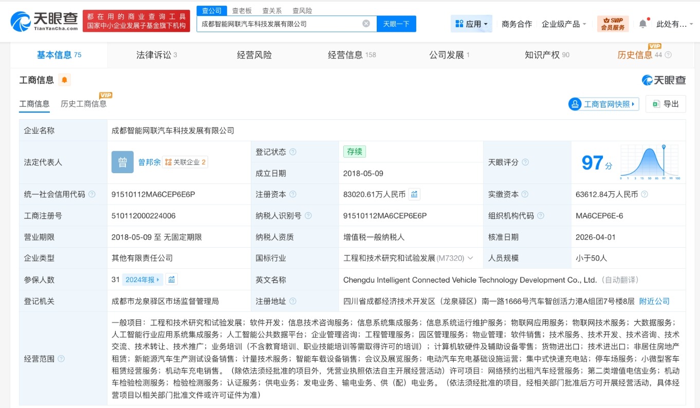 成都智能网联汽车科技发展公司增资至8.3亿 增幅约31%