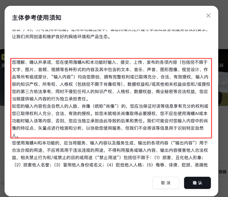 AI视频进入大规模商用,风险也同步扩大,大模型平台最先警觉这一点。今年2月起,即梦的Seedance 2.0限制上传真人人脸作为参考素材;海螺 AI 则在上传环节增加了《主体参考使用须知》,要求用户自行承担肖像权责任,并提示避免侵权。