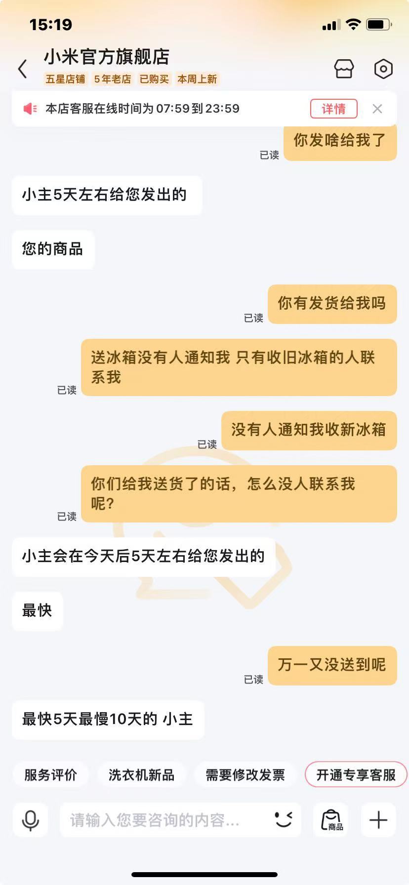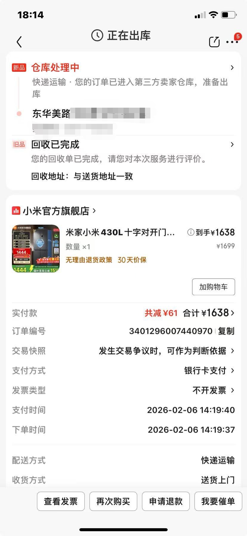 据吴女士介绍,母亲家中的西门子冰箱使用年限过长,制冷效果大不如前。恰逢国家推出了家电以旧换新补贴政策,她打算在春节前为母亲完成冰箱的升级换代。2月6日,她在一家电商平台的小米官方旗舰店,下单了小米430L十字对开门冰箱,享受补贴后实付价1638元。“按相关流程,平台会派人先上门回收旧冰箱,再送新品。”但等了几天,也不见有人主动联系,吴女士询问平台客服,对方以“临近春节人手紧张”为由,提出推迟到春节后再上门回收。