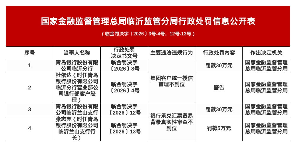 罚单显示,青岛银行股份有限公司临沂分行的主要违法违规事实(案由)为:集团客户统一授信管理不到位。