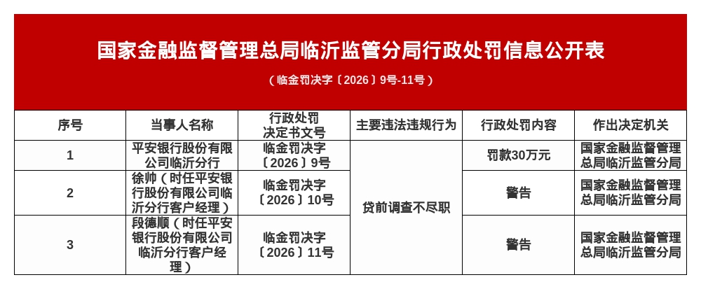 平安银行临沂分行被罚30万,涉贷前调查不尽职