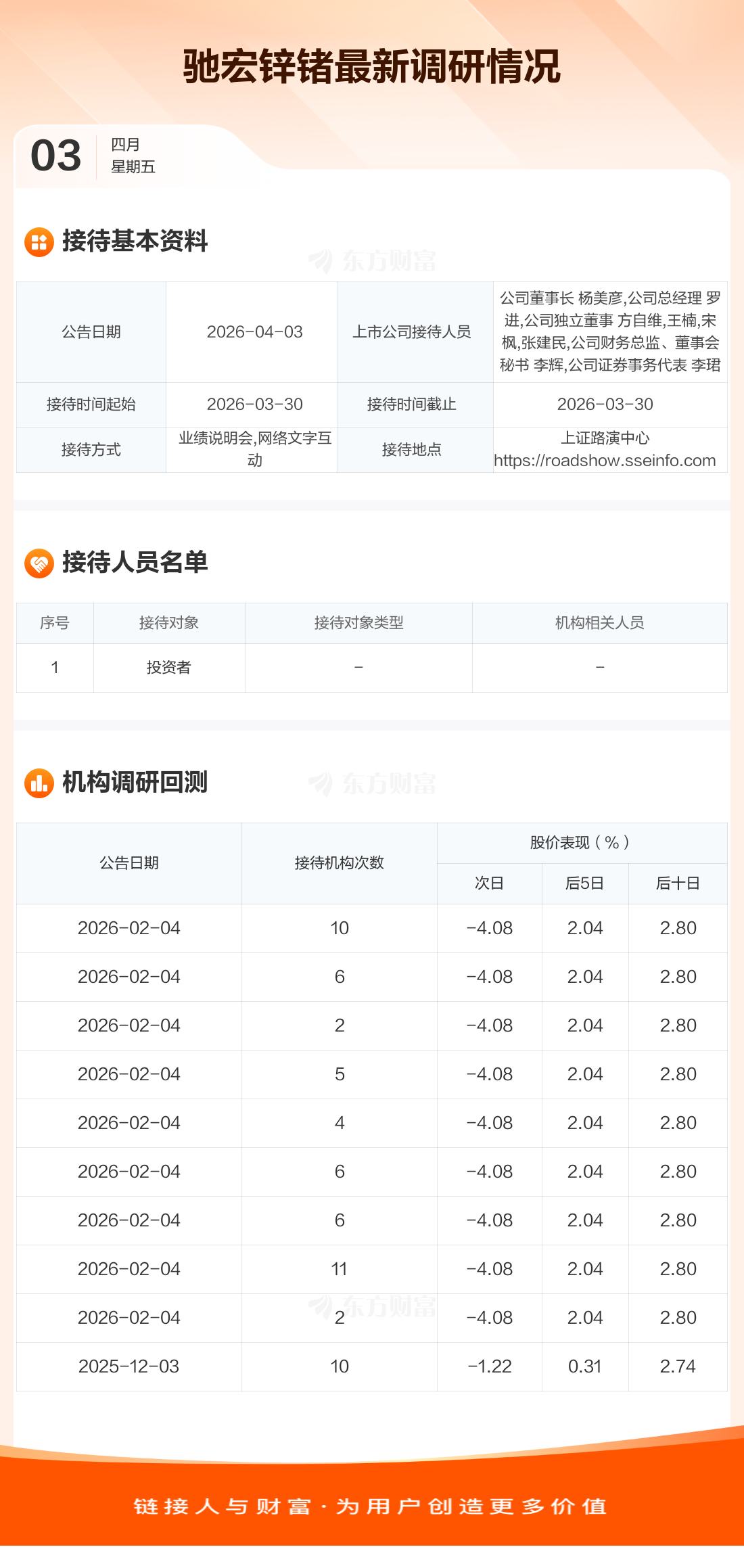 驰宏锌锗4月3日公告称,3月30日接待投资者等1家机构调研。接待人员包括公司董事长 杨美彦,公司总经理 罗进,公司独立董事 方自维,王楠,宋枫,张建民,公司财务总监、董事会秘书 李辉,公司证券事务代表 李珺。