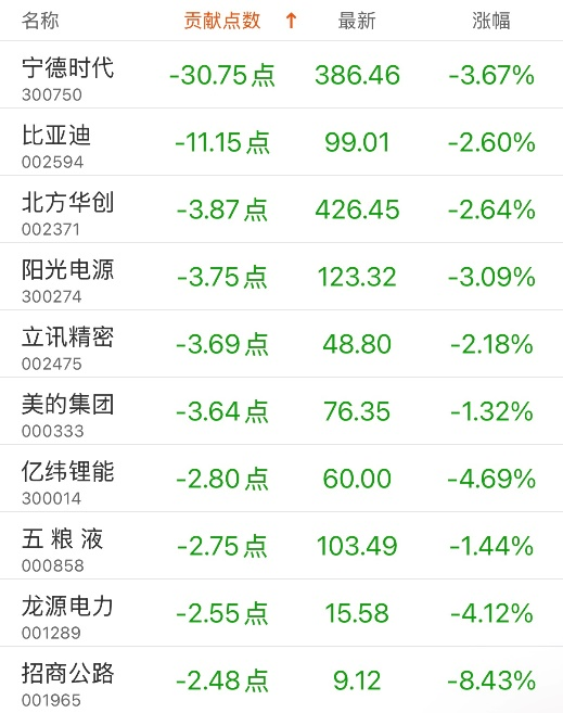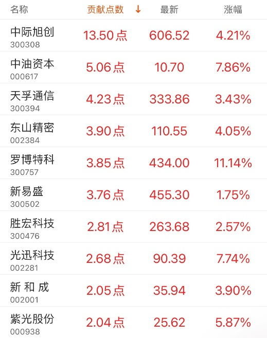 对深证成指贡献点数最多的个股是中际旭创,贡献13.5点,该股当日涨4.21%,收盘价606.52元;拖累点数最多的个股是宁德时代,拖累30.75点,该股当日跌3.67%,收盘价386.46元。