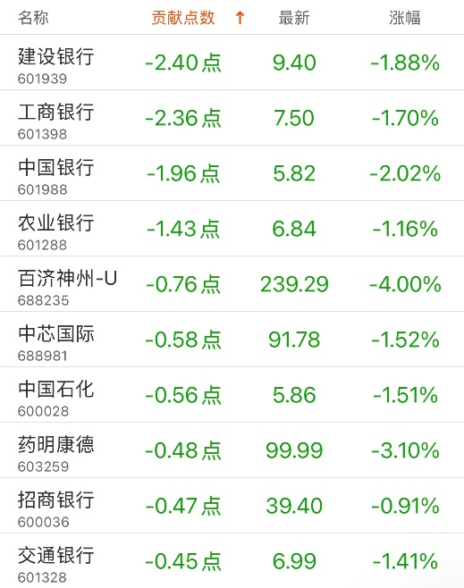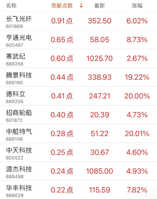 对上证指数贡献点数最多的个股是长飞光纤,贡献0.91点,该股当日涨6.02%,收盘价352.5元;拖累点数最多的个股是建设银行,拖累2.4点,该股当日跌1.88%,收盘价9.4元。