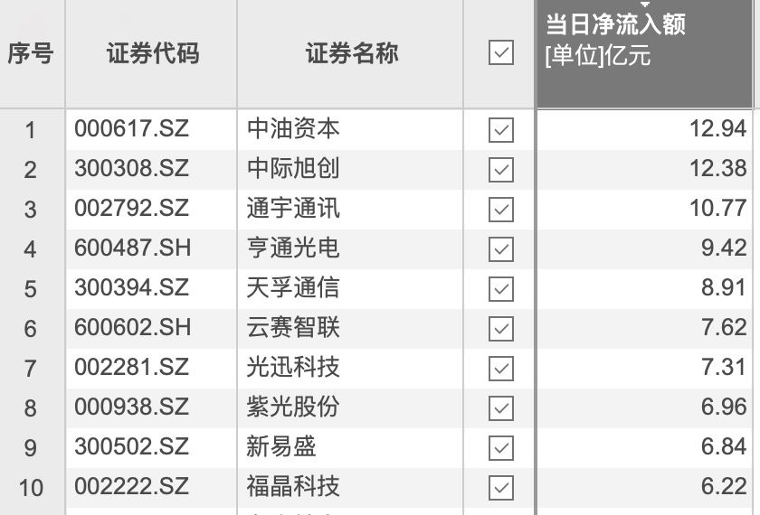 上证报中国证券网讯(记者李雨琪)Choice数据显示,4月3日,资金净流入额排名前十的个股依次是中油资本、中际旭创、通宇通讯、亨通光电、天孚通信、云赛智联、光迅科技、紫光股份、新易盛、福晶科技。其中,中油资本获净流入12.94亿元。