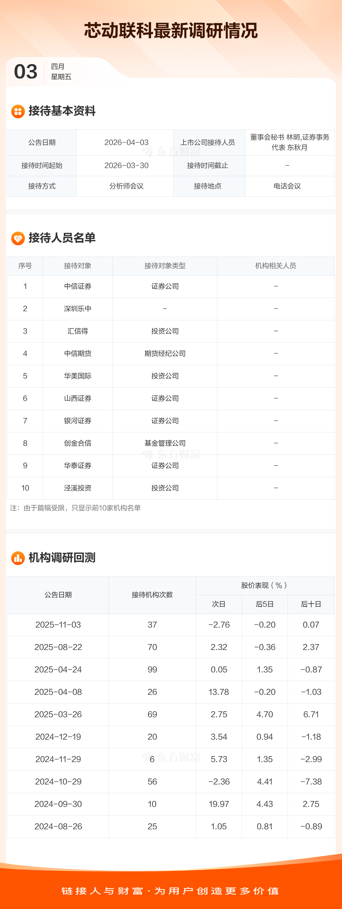 芯动联科4月3日公告称,3月30日接待中信证券等39家机构调研。接待人员包括董事会秘书 林明,证券事务代表 东秋月。