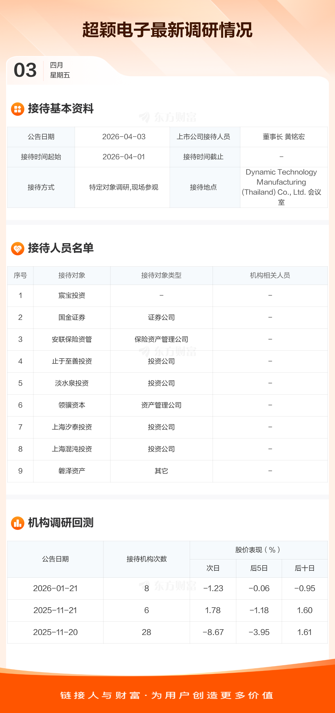 超颖电子4月3日公告称,4月1日接待宸宝投资等9家机构调研。接待人员包括董事长 黄铭宏。